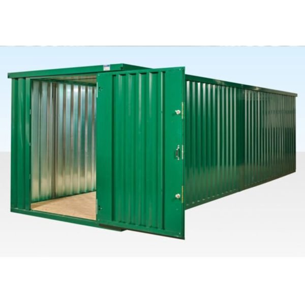End-on-end linking of flat pack storage containers is a fast and easy method of creating storage for long lengths of materials. The combination of two x 4m green powder coated containers joined together gives an internal length of 7.56m.