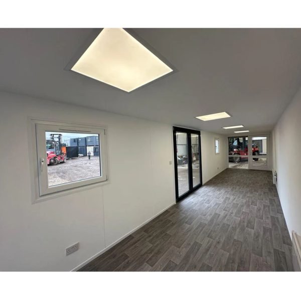 It has been fully plastered & finished in a matte white, with full glazing to each end panel; this container conversion is a real head-turner & it would certainly make a stunning portable working space!